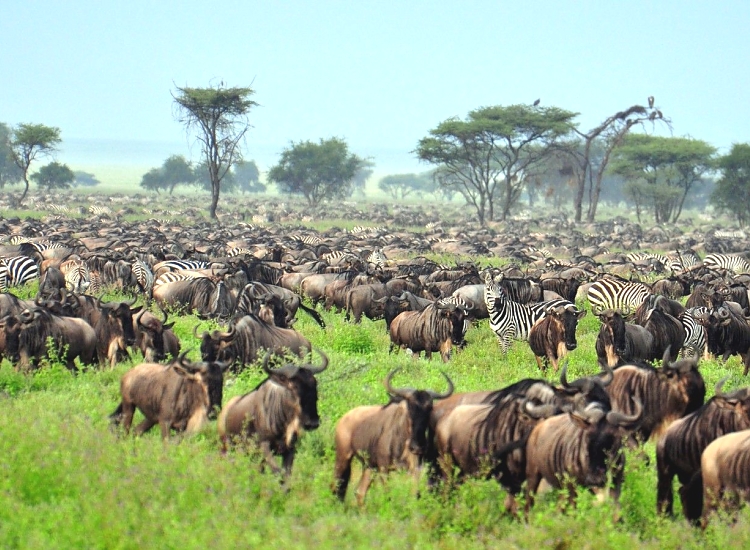 The great wildebeest migration of over 1.3 million accompanied by large numbers of zebra, and smaller numbers of Grant's & Thomson's gazelle, eland and impala with an annual pattern seeking fresh grazing and water. Having a chance of encountering this phenomena has being described as one of the natural wonders and gives you a life time experience from nature.
